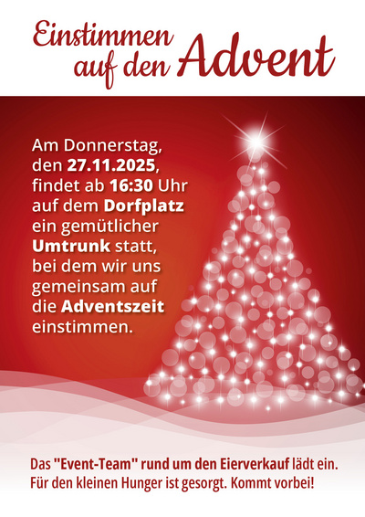 Am Donnerstag, den 27.11.2025, findet ab 16:30 Uhr auf dem Dorfplatz ein gemütlicher Umtrunk statt, bei dem wir uns gemeinsam auf die Adventszeit einstimmen.
