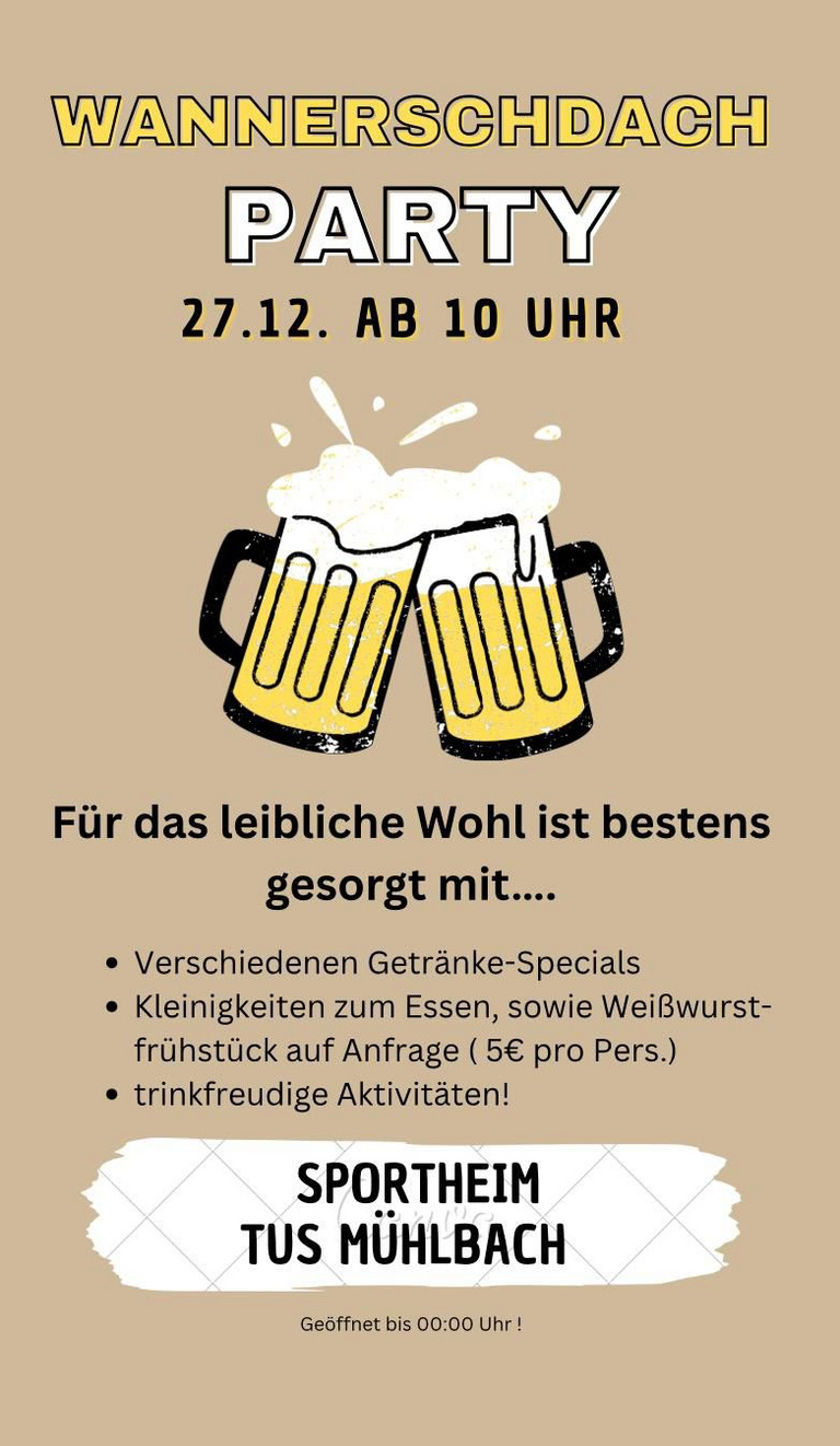 Am 27. Dezember findet im Sportheim in Mühlbach die traditionelle Wannerschdach-Party statt. Ab 10 Uhr können sich Besucher auf verschiedene Getränke-Specials und kleine Snacks freuen. Auf Anfrage wird zudem ein Weißwurstfrühstück angeboten (Kosten: 5 € pro Person). Für gesellige Aktivitäten ist ebenfalls gesorgt. Das Sportheim bleibt bis 00:00 Uhr geöffnet.